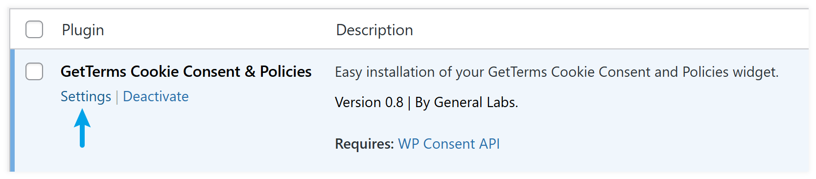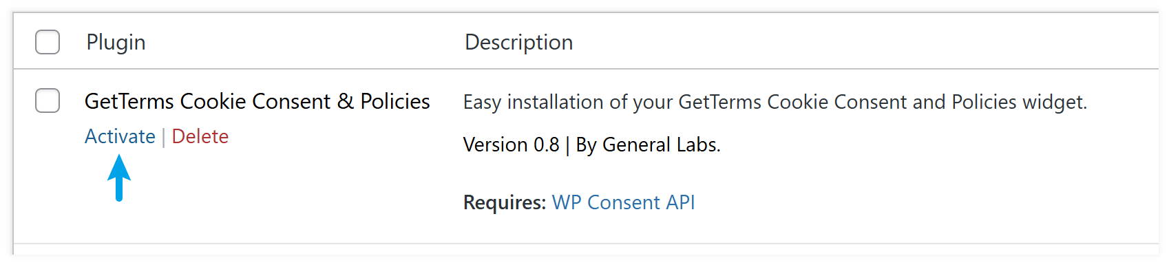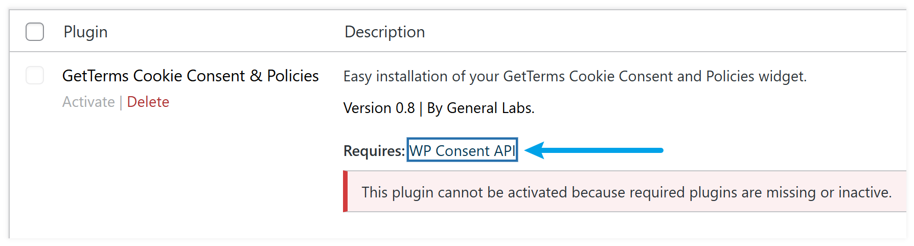 Once installed, you'll find you are unable to activate our plugin until you've installed and activated WP Consent API to activate the plugin. WP Consent API is a highly trusted plugin that standardizes the communication of accepted consent categories between our banner and other plugins.
