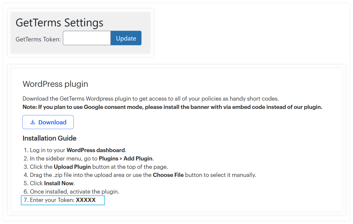 A window will open with instructions for embedding your policy, including a link to download the WordPress plugin.