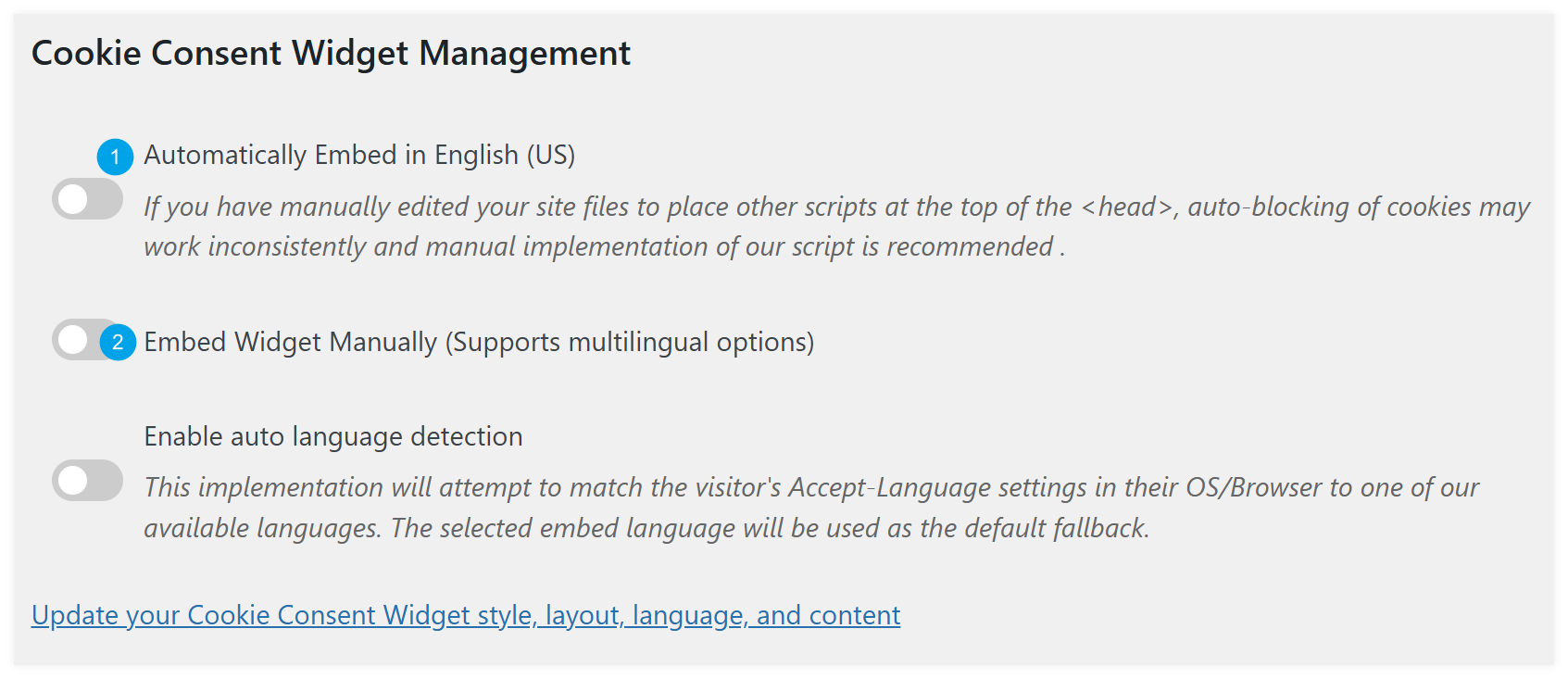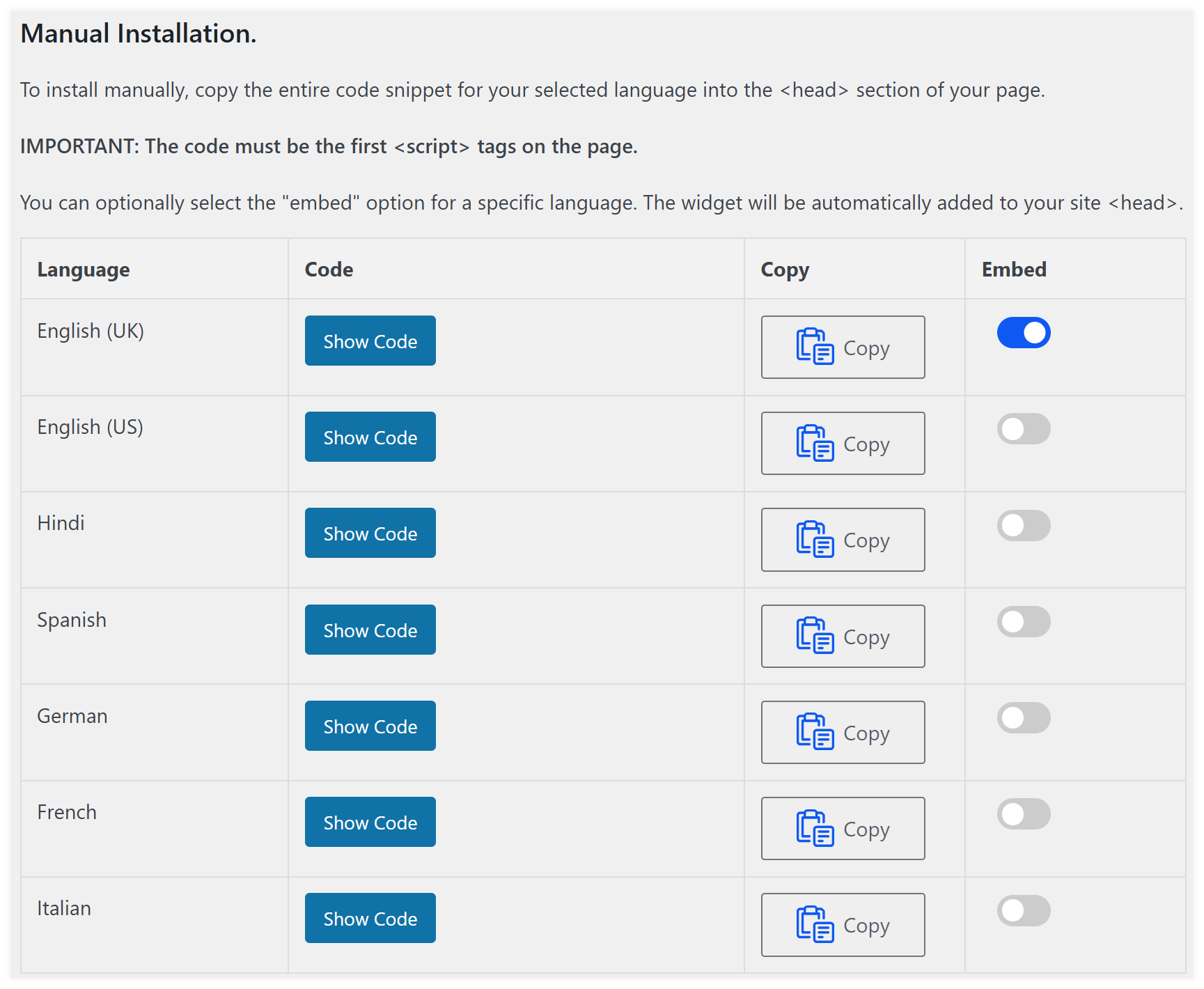 Manually add: "Embed Widget Manually (Supports multilingual options)". Click the embed toggle for the language you wish to enable. Only enable one language at a time.