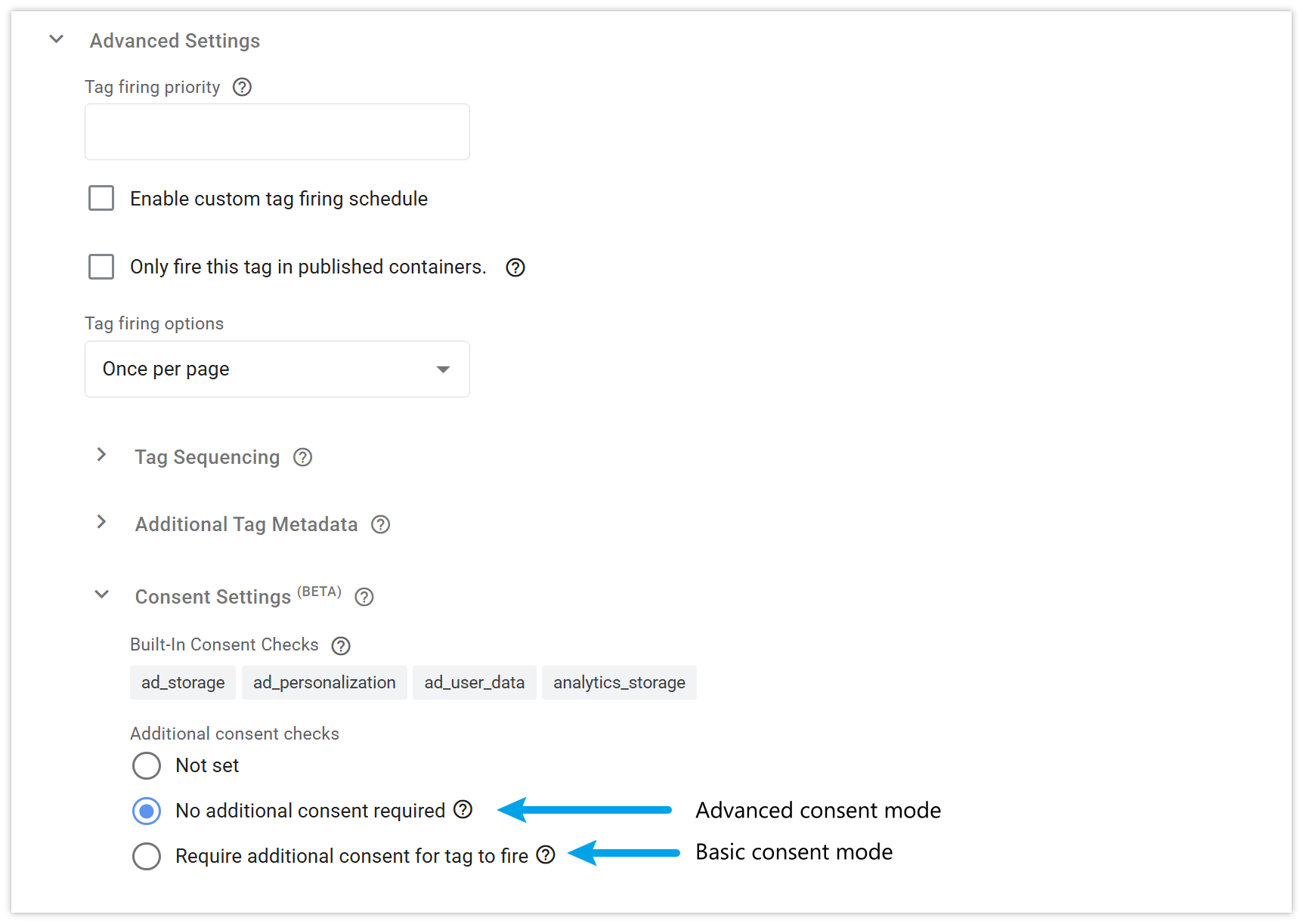 In Google Tag Manager, make sure your tags are configured with the necessary consent checks.